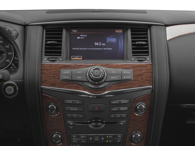 13 Speakers, 2.937 Axle Ratio, 2nd & 3rd Row Carpeted Mats, 3rd row seats: split-bench, 4-Wheel Disc Brakes, ABS brakes, Activation Disclaimer, Air Conditioning, Alloy wheels, AM/FM radio: SiriusXM, Anti-whiplash front head restraints, Auto tilt-away steering wheel, Auto-dimming door mirrors, Auto-dimming Rear-View mirror, Auto-leveling suspension, Automatic temperature control, Brake assist, Bumpers: body-color, CD player, Delay-off headlights, Driver door bin, Driver vanity mirror, Dual front impact airbags, Dual front side impact airbags, Electronic Stability Control, Emergency communication system: NissanConnect Services, Four wheel independent suspension, Front anti-roll bar, Front Bucket Seats, Front Center Armrest, Front dual zone A/C, Front fog lights, Front reading lights, Fully automatic headlights, Garage door transmitter: HomeLink, Heated door mirrors, Heated Front Bucket Seats w/Driver Memory, Heated front seats, Illuminated entry, Leather Shift Knob, Leather-Appointed Seat Trim, Low tire pressure warning, Memory seat, Navigation System, Occupant sensing airbag, Outside temperature display, Overhead airbag, Overhead console, Panic alarm, Passenger door bin, Passenger vanity mirror, Power door mirrors, Power driver seat, Power Liftgate, Power passenger seat, Power steering, Power windows, Radio data system, Radio: Bose AM/FM/SXM/CD/MP3/HD Radio, Rain sensing wipers, Rear air conditioning, Rear anti-roll bar, Rear reading lights, Rear seat center armrest, Rear window defroster, Rear window wiper, Reclining 3rd row seat, Remote keyless entry, Roof rack: rails only, Security system, Speed control, Speed-sensing steering, Speed-Sensitive Wipers, Split folding rear seat, Spoiler, Steering wheel memory, Steering wheel mounted audio controls, Tachometer, Telescoping steering wheel, Tilt steering wheel, Traction control, Trip computer, Turn signal indicator mirrors, Variably intermittent wipers, Voltmeter, Wheels: 20 Machined Finish Painted Alloy.